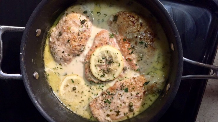 Salt and pepper the chicken and let it rest at room temperature for 20 minutes. Dredge the chicken in the flour. Heat nonstick skillet to medium high heat and drizzle a little olive oil to coat the pan. Place the chicken in the skillet and cook about 2-3 minutes on each side until brown and slightly crispy. Remove chicken from pan and reduce heat. Add butter and garlic to the existing pan. Add a splash of wine and scrape up the bits in the pan from the chicken and garlic. Squeeze the juice of lemon into a bowl (pick out any seeds) and pour into to the skillet. Add chicken broth, salt and pepper and bring to a soft boil. Add in a few slices of lemon, capers and the cream. Reduce heat and add in the chicken to soak up the favors.